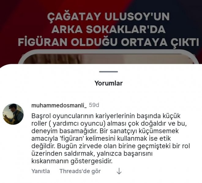 Sosyal medyada, ünlü oyuncu Çağatay Ulusoy'un kariyerinin ilk yıllarında popüler dizi 'Arka Sokaklar'da figüranlık dahil küçük roller aldığına dair çıkan haberler ve bu konudaki tartışmalara, Gazeteci, Editör ve Oyuncu kimliğiyle tanınan Muhammed Osmanlı'dan destekleyici ve etik bir bakış açısıyla yorum geldi.